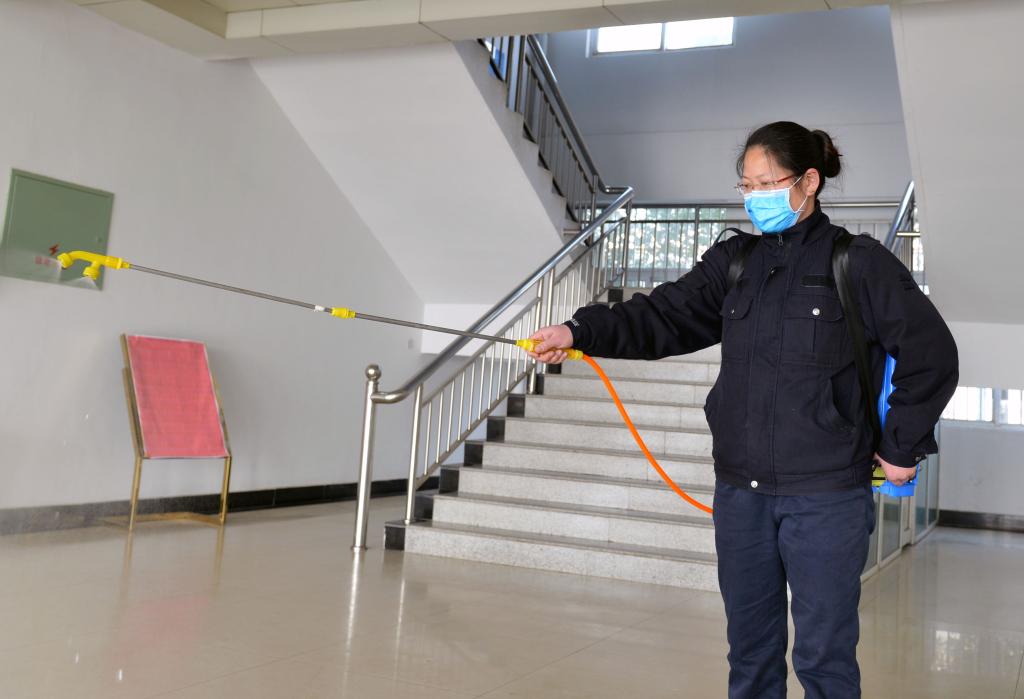 “早上7點多,職工師傅們就開始來上班了,我們必須搶在前面消毒,不能想著暖和一些晚一會再干活……”四十斤的消毒液噴霧筒背在這些女職工柔弱的肩上,看上去走路都有些吃力,別提再爬樓梯了。
