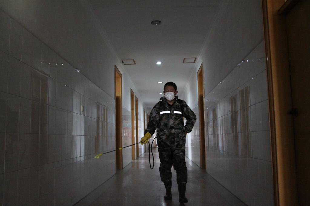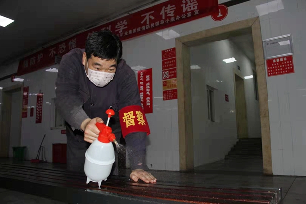 該礦物業(yè)科衛(wèi)生隊黨員劉洋,背著噴霧器每4小時一次對辦公樓走廊、職工宿舍、衛(wèi)生間及所屬崗位進行消毒,對食堂等關(guān)鍵重點場所每日不少于3次消毒。(王亮 陳更)