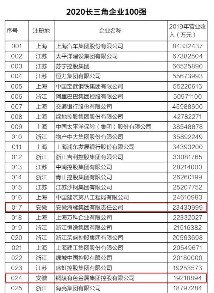 該榜單以2019年企業營業收入為入圍標準,由長三角三省一市企業聯合會共同發布。今年是第二次發布長三角企業百強排行榜,入圍門檻是563.8億元,比上年提高了54.5億元。今年我省共有9家企業上榜,除淮北礦業集團外,其他8家企業為海螺集團、銅陵有色、中鐵四局、聯寶(合肥)電子、全威(銅陵)銅業、美的集團蕪湖公司、奇瑞控股集團和合肥百大,主要分布在水泥建材、有色金屬、汽車制造、煤炭和煤化工等行業。